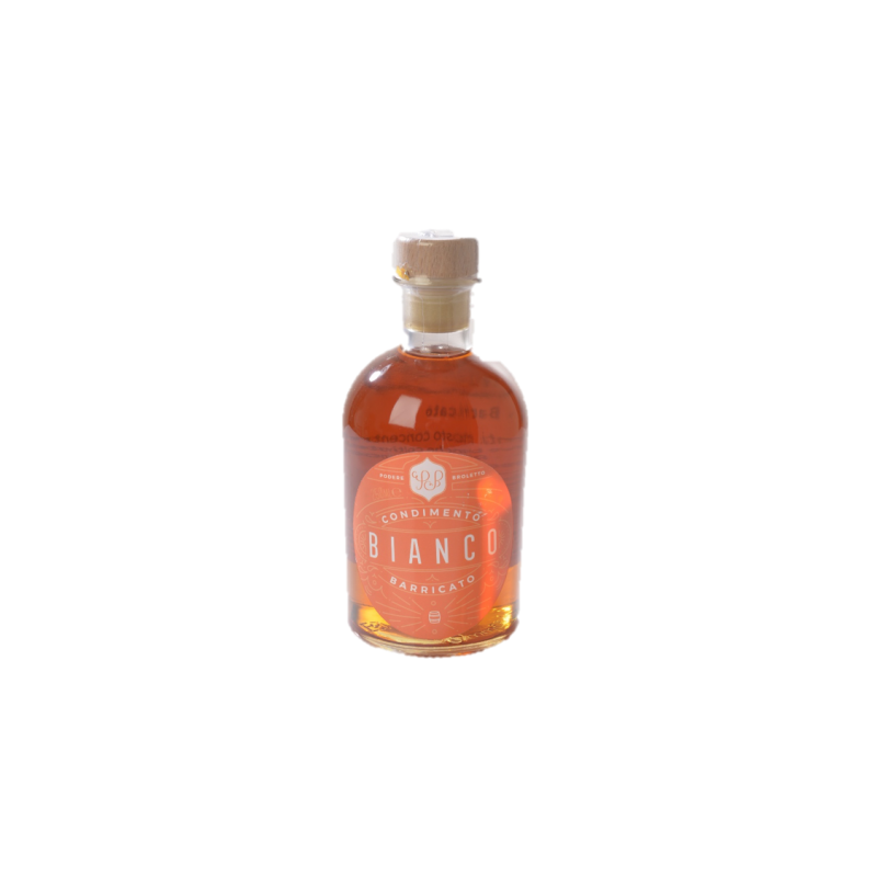Il condimento bianco barricato viene ottenuto da mosto d’uva bianca prodotto a partire dalle nostre uve collinari e aceto di vino bianco. L’affinamento di 12 mesi in botti di rovere ne arricchisce l’aromaticità e il gusto. Perfetto per l’uso quotidiano, per completare insalate, cucinare pietanze in agrodolce, per marinature e in abbinamento a carni bianche e pesce.