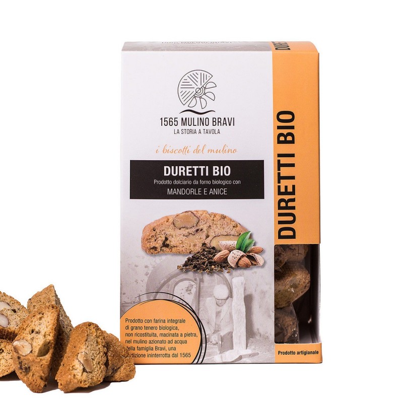 Le materie prime utilizzate sono integralmente bio: farina di grano tenero integrale non ricostituita macinata a pietra bio, mandorle bio, semi di anice bio, burro bio, uova bio e zucchero di canna bio.