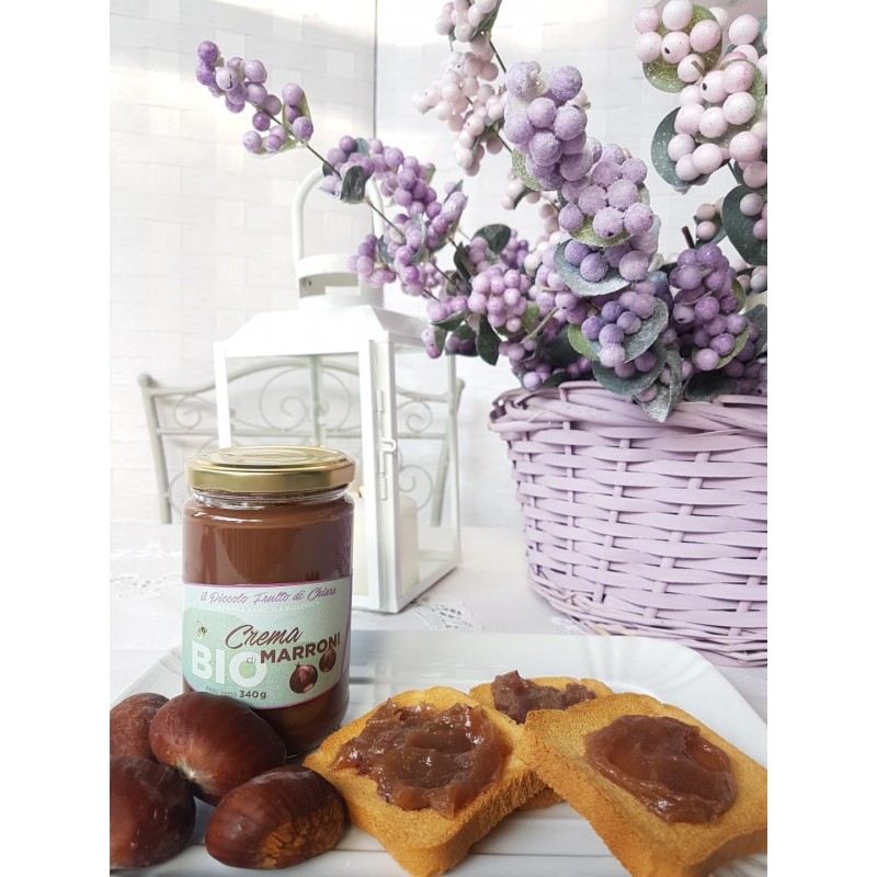 La nostra crema viene preparata utilizzando una pregiata varietà di marroni da noi coltivata: la"Bouche de Betizac". Il frutto di grosse dimensioni, si caratterizza per la sua polpa dolce e saporita. Dalla sua lavorazione ha così origine questa ottima crema spalmabile, adatta da abbinare a una fetta di pane da gustare in qualsiasi momento della giornata.