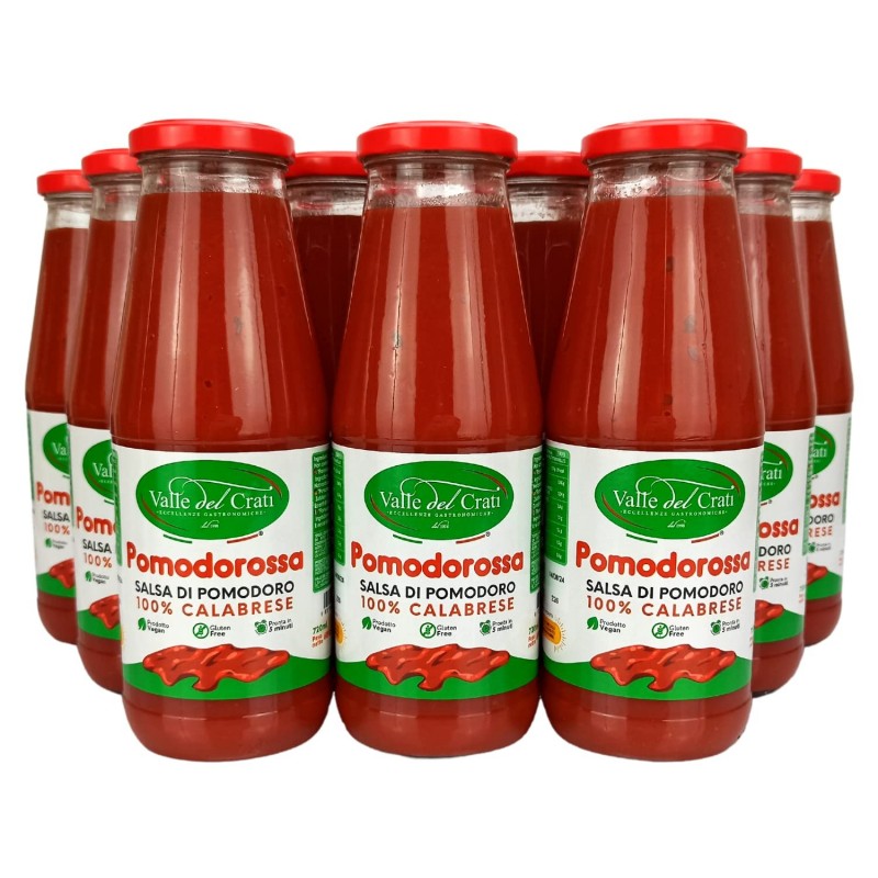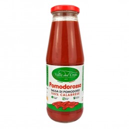 Salsa di pomodoro delicata dal sapore dolce, ottenuta dalla lavorazione di pomodori freschi coltivati in campo aperto e maturati al sole. Il sapore inconfondibile è quello della salsa di pomodoro fresco tradizionale fatta in casa dalle nostre nonne , senza aggiunta di conservanti e coloranti, e senza utilizzo nell’intero ciclo di produzione di coadiuvanti tecnologici, nel rispetto della migliore tradizione calabrese.