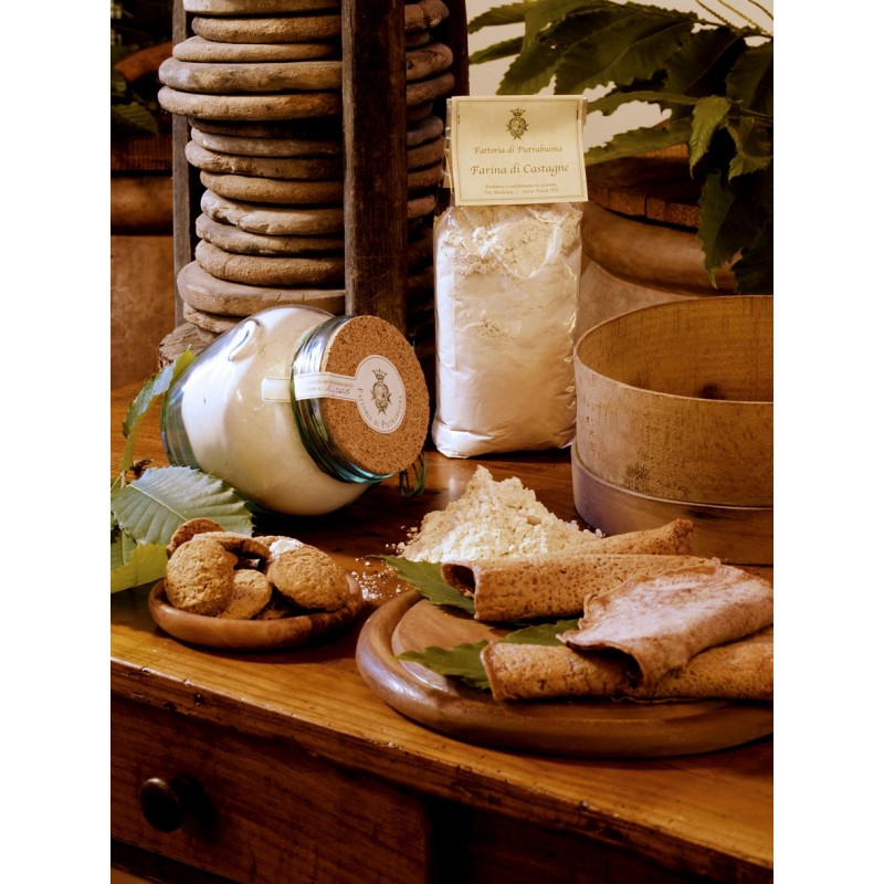 La paziente raccolta a mano, i tempi lunghi di essiccazione (circa 50 giorni), l’odore dei ceppi di castagno che bruciano piano (con un attento controllo del fuoco), la minuziosa selezione amanuense delle castagne secche “poco buone”, sono gli ingredienti per ottenere una farina dal sapore delicato e genuino.