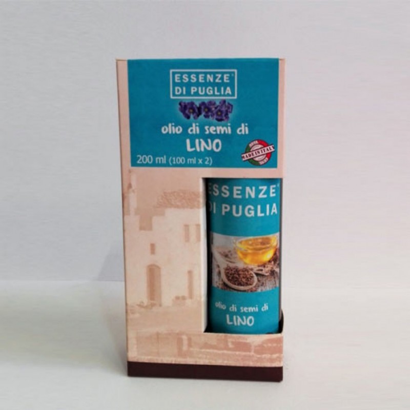 Olio di semi di lino spremuto a freddo, unico nella sua varietà, ricco di grassi polinsaturi e omega-3 e 6. Prodotto all'interno della rete Essenze di Puglia