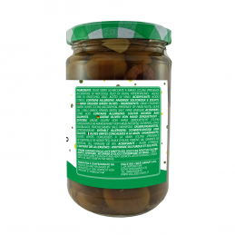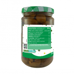 Ingredienti: Olive verdi schiacciate a mano (72,5%) (presenza accidentale di noccioli), olio di oliva, peperoncino, aglio, semi di finocchio, sale, aceto di vino.
