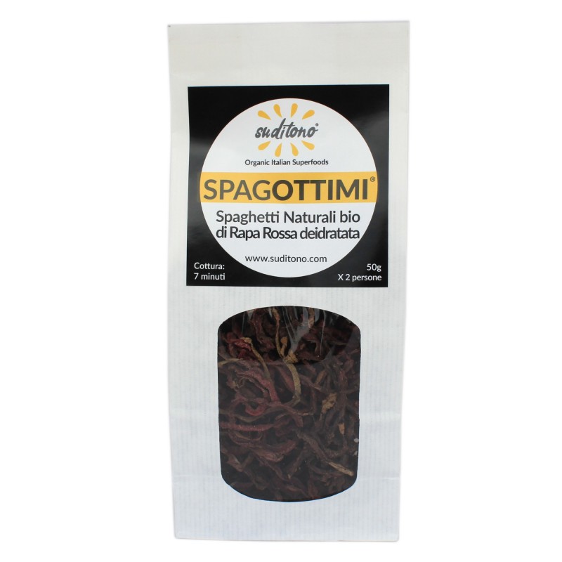 Gli SPAGOTTIMI di RAPA ROSSA sono spaghetti naturali di verdure deidratate, che rivoluzionano l’idea di “pasta”: sono fatti con 100% rape rosse biologiche deidratate da Agricoltura Integrale, ma totalmente privi di farine e glutine.