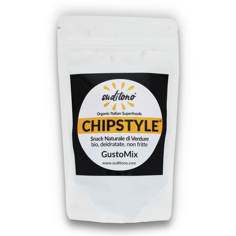 CHIPSTYLE GUSTO MIX è lo snack naturale per davvero: completamente senza sale e non fritto, privo di conservanti o aromi aggiunti. Nasce da una combinazione esclusiva ed originale di verdure ed erbe: un mix esplosivo di patate, rapa rossa, topinambur, zucchine, sedano e pomodorini.