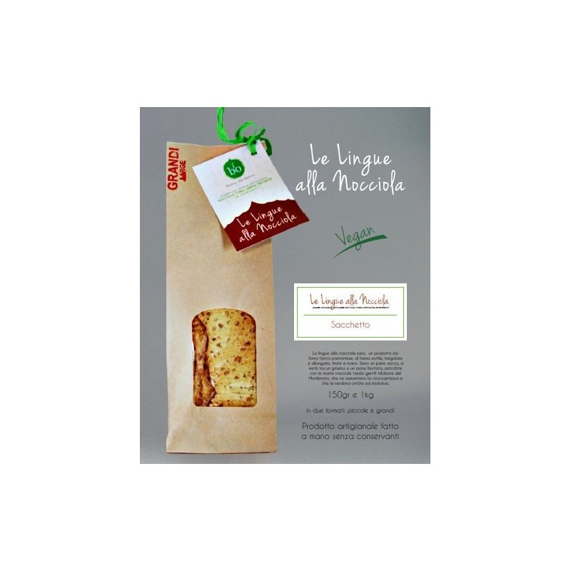 Le lingue alla nocciola sono un prodotto da forno tipico piemontese, di forma sottile, irregolare e allungata, tirate a mano. Sono un pane secco, a metà tra un grissino e un pane lievitato, arricchite con le nostre nocciole tonde gentili trilobate del Monferrato, che ne aumentano la croccantezza e che le rendono uniche ed esclusive.