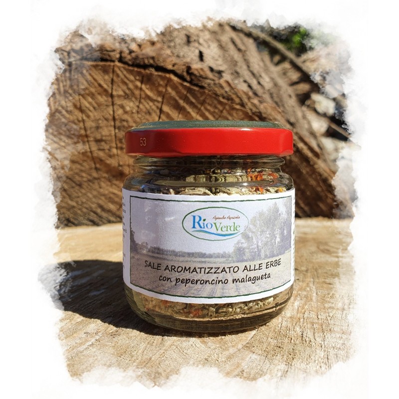 Sale aromatizzato alle erbe aromatiche con sale bianco integrale, rosmarino, salvia e peperoncino malagueta.