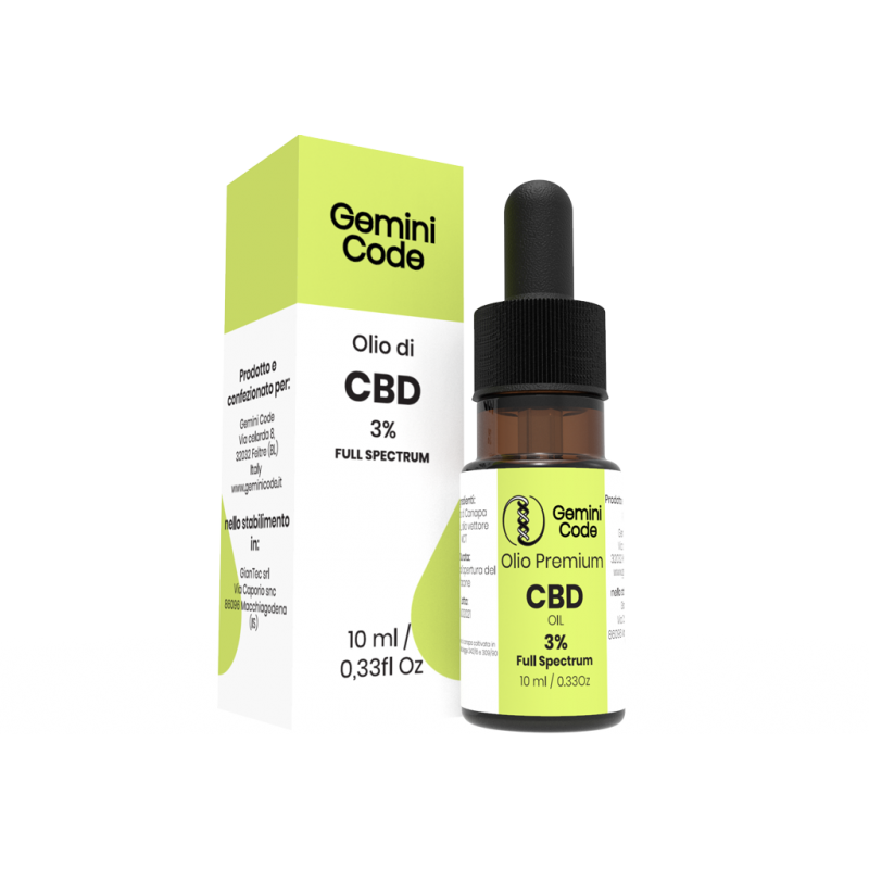 L'olio CBD Full Spectrum di Gemini Code è confezionato in un pratico flacone contagocce, per dosare il prodotto senza problemi.